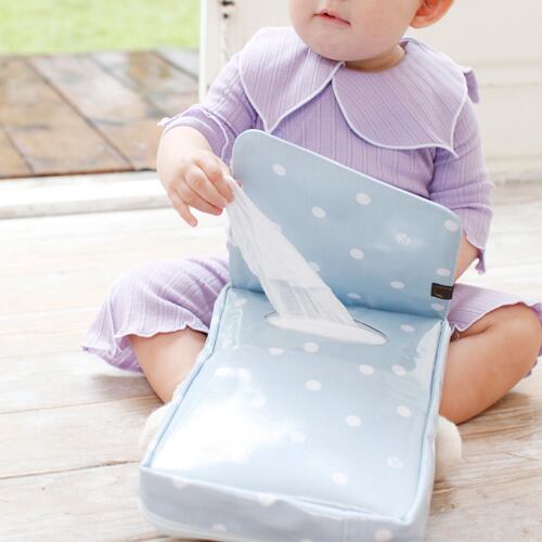 片手で開閉できるマグネットフラップをめくれば、赤ちゃんを抱っこしながらでもサッとウエットティッシュを取り出せる仕様。